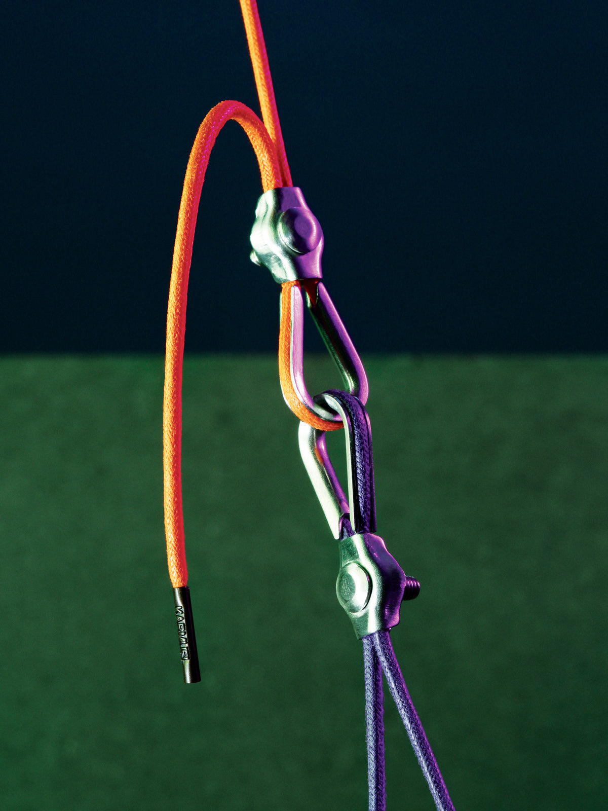 SL-690 orange and purple waxed cotton plain weaved shoelaces with stainless steel simplex clips and thimbles